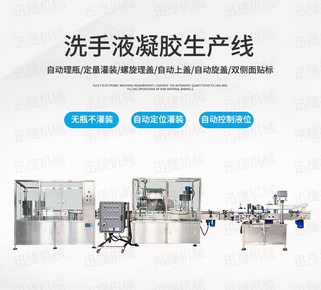 5、迅捷機械研發灌裝設備具有無瓶不灌裝、自動進瓶出瓶、自動定位灌裝、自動控制液位等功能,自動化程度高;自動化消毒液灌裝生產線灌裝嘴設計科學合理,配防滴漏裝置,灌裝不滴漏,擁有物料瓶及設備的干凈衛生。
